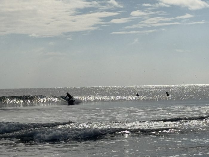 テイクオフで正面(岸側)を見てしまうと、ボードは自然に下方向へ加速し、ボトムまで落ちてしまいます。サーフィンは目線が進行方向をつくるスポーツ。横へ行きたければ、テイクオフの瞬間からしっかり走りたい方向のダウンザラインを見ることが重要です。
